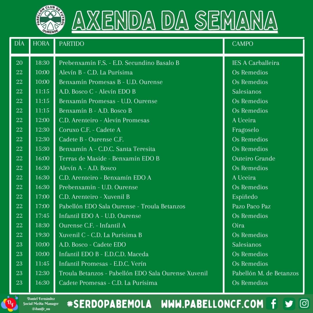 Horarios dos nosos equipos para esta semana (20, 22 e 23 de maio)